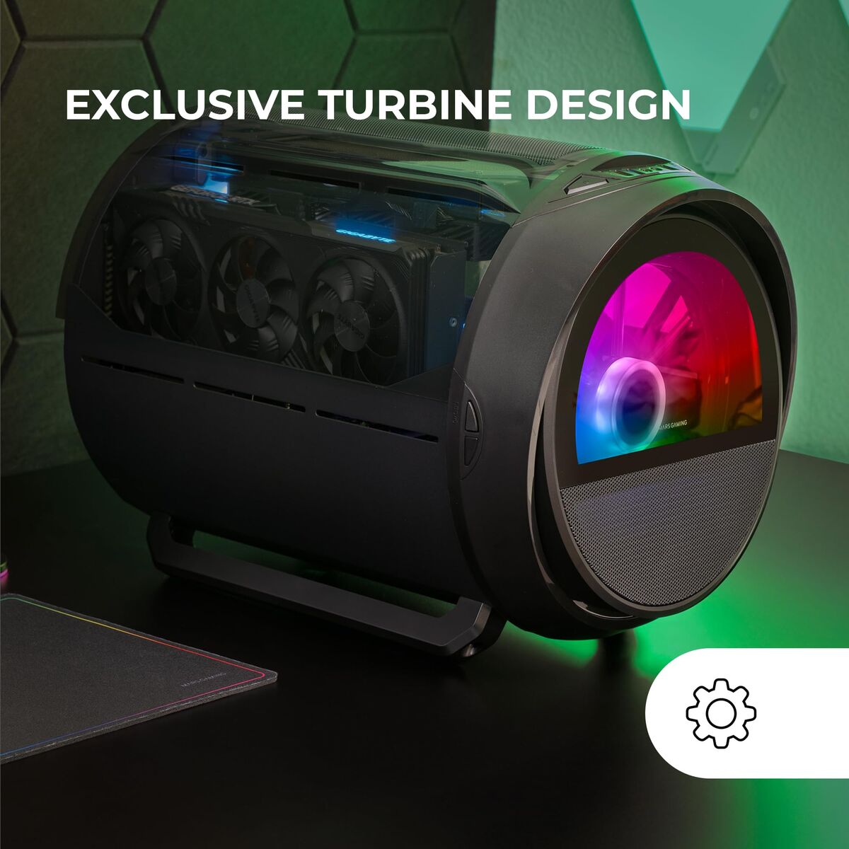 La MC-CYLON rompe con el diseño tradicional de cajas gaming. Su diseño cilíndrico, inspirado en turbinas futuristas, redefine las reglas del gaming. Es una declaración visual de poder y personalidad para creadores, jugadores y entusiastas que buscan algo más que una torre: una pieza central con identidad propia.