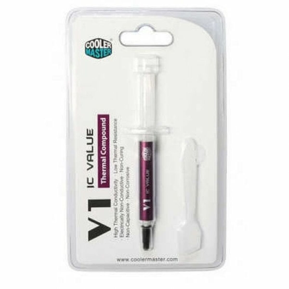 Cooler Master IC Value V1. Conductividad térmica: 1,85 W/m·K, Densidad: 2,5 g/cm³, Color del producto: Blanco. Volumen: 2 ml, Peso: 8 g. Cantidad por paquete: 1 pieza(s), Tipo de embalaje: Blister