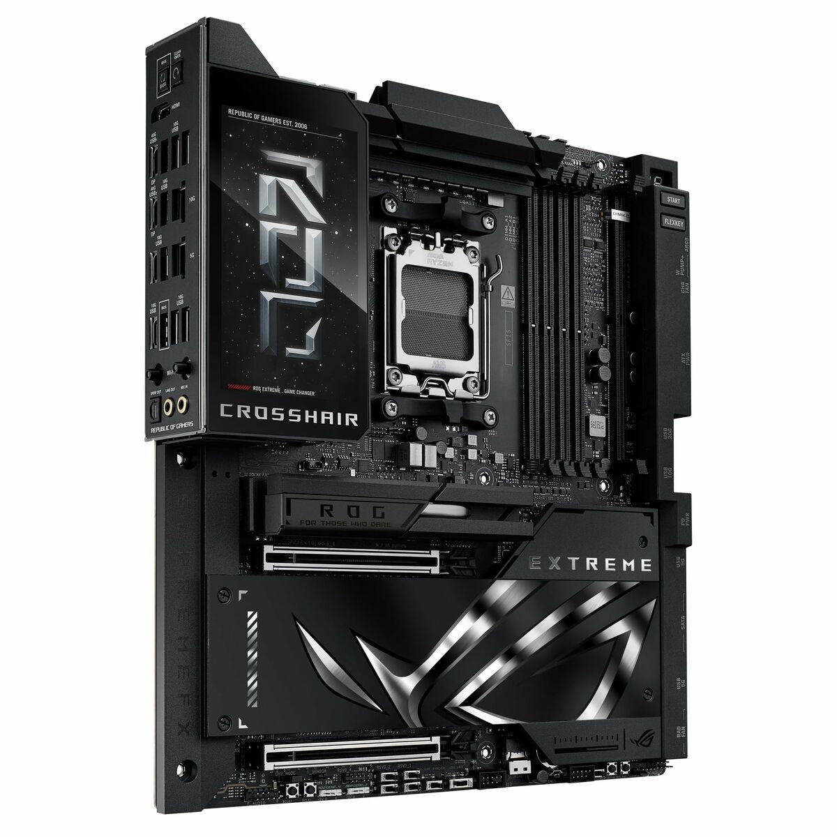 ASUS ROG CROSSHAIR X870E EXTREME. Fabricante de procesador: AMD, Socket de procesador: Zócalo AM5, Procesador compatible: AMD Ryzen 7000 Series, AMD Ryzen 8000 Series, AMD Ryzen 9000 Series. tipos de memoria compatibles: DDR5-SDRAM, Memoria interna máxima: 256 GB, Tipo de ranuras de memoria: DIMM. Interfaces de disco de almacenamiento soportados: M.2, SATA III, SlimSAS, Tipos de unidades de almacenamiento admitidas: HDD & SSD, Niveles RAID: 0, 1, 5, 10. Tipo de interfaz ethernet: 5 Gigabit Ethernet, 10 Gigabit Ethernet, Estándar Wi-Fi: Wi-Fi 7 (802.11be), Wi-Fi estándares: Wi-Fi 7 (802.11be). Componente para: PC, Factor de forma: ATX extendida, Familia del chipset: AMD