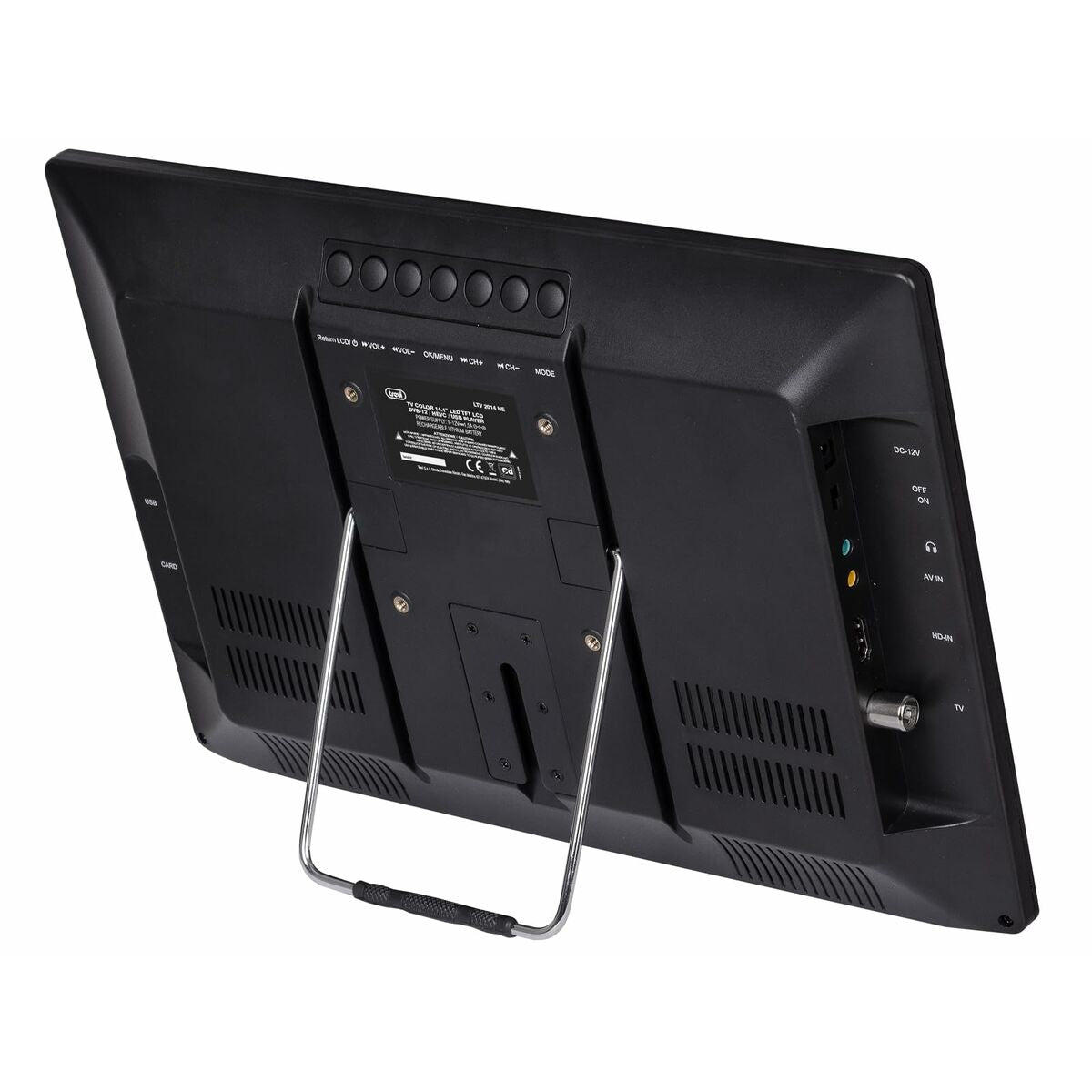 Trevi LTV 2014 HE. Diagonal de la pantalla: 35,8 cm (14.1"), Tecnología de visualización: LCD, Resolución de la pantalla: 1280 x 800 Pixeles. Tipo de sintonizador: Digital, Formato de señal digital: DVB-T, DVB-T2. Formatos de audio soportados: MP3, Formatos de imagen soportados: JPG. Tarjetas de memoria compatibles: SD. Tipo de producto: TV portátil, Color del producto: Negro