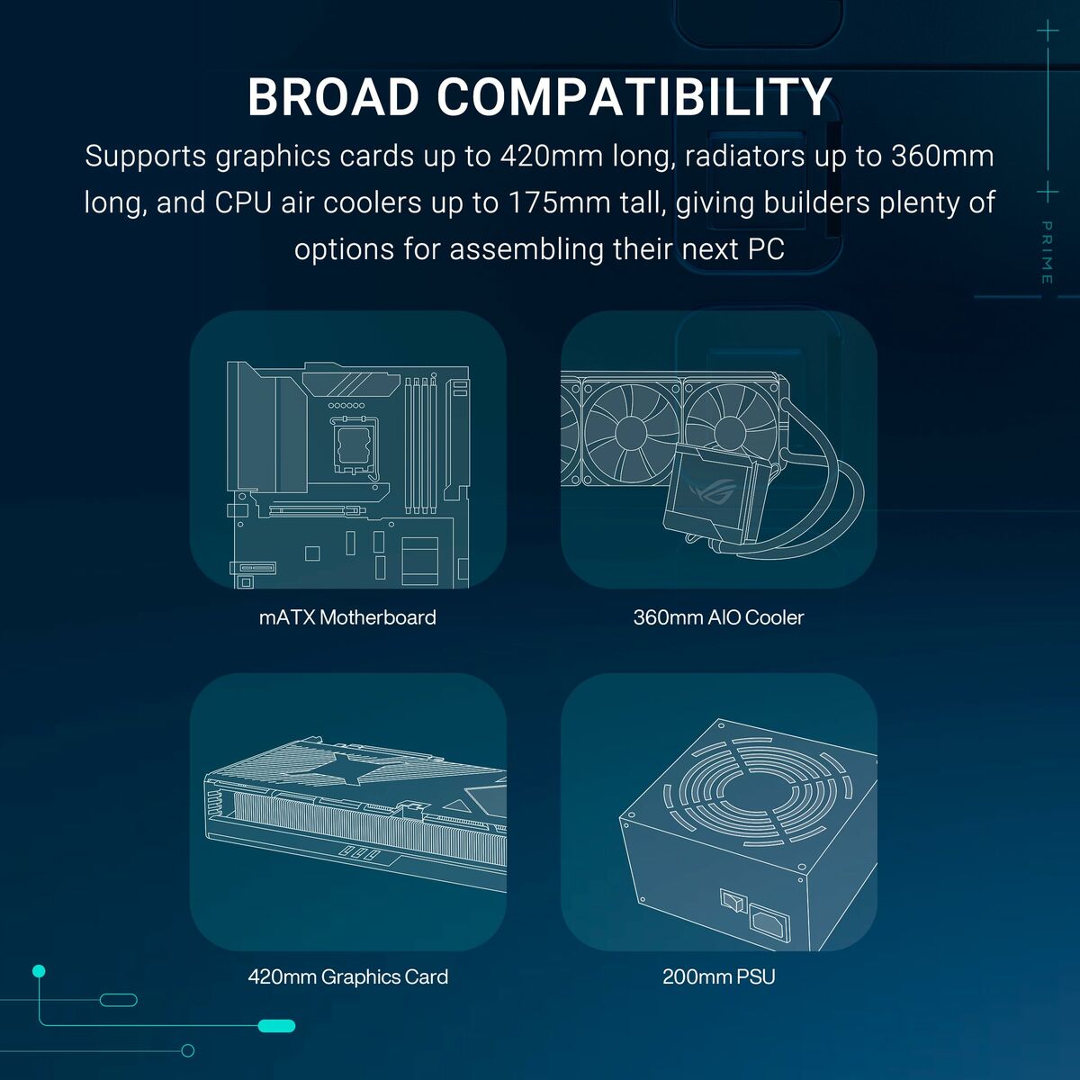 ASUS PRIME AP202 ARGB. Tipo: PC, Color del producto: Blanco, Formas de factor de tarjeta madre soportadas: micro ATX, Mini-ITX. Ventiladores laterales instalados: 2x 120 mm, Ventiladores traseros instalados: 1x 120 mm, Diámetro de ventiladores traseros soportados: 120 mm. Tamaños de disco duro soportados: 2.5,3.5". Ancho: 236 mm, Profundidad: 441 mm, Altura: 460 mm