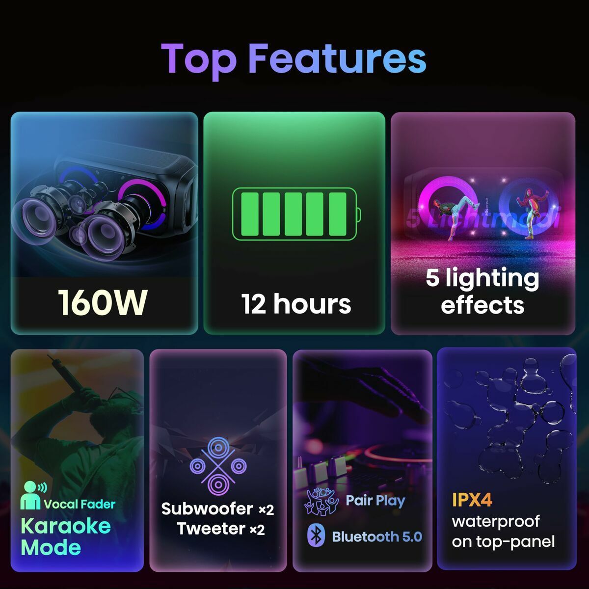 Hisense Party Rocket 160. Canales de salida de audio: 2.0 canales. Potencia estimada RMS: 160 W. Tecnología de conectividad: Inalámbrico y alámbrico. Tipo de producto: Altavoz para fiestas, Color del producto: Negro, Código IP (International Protection): IPX4. Uso recomendado: Universal