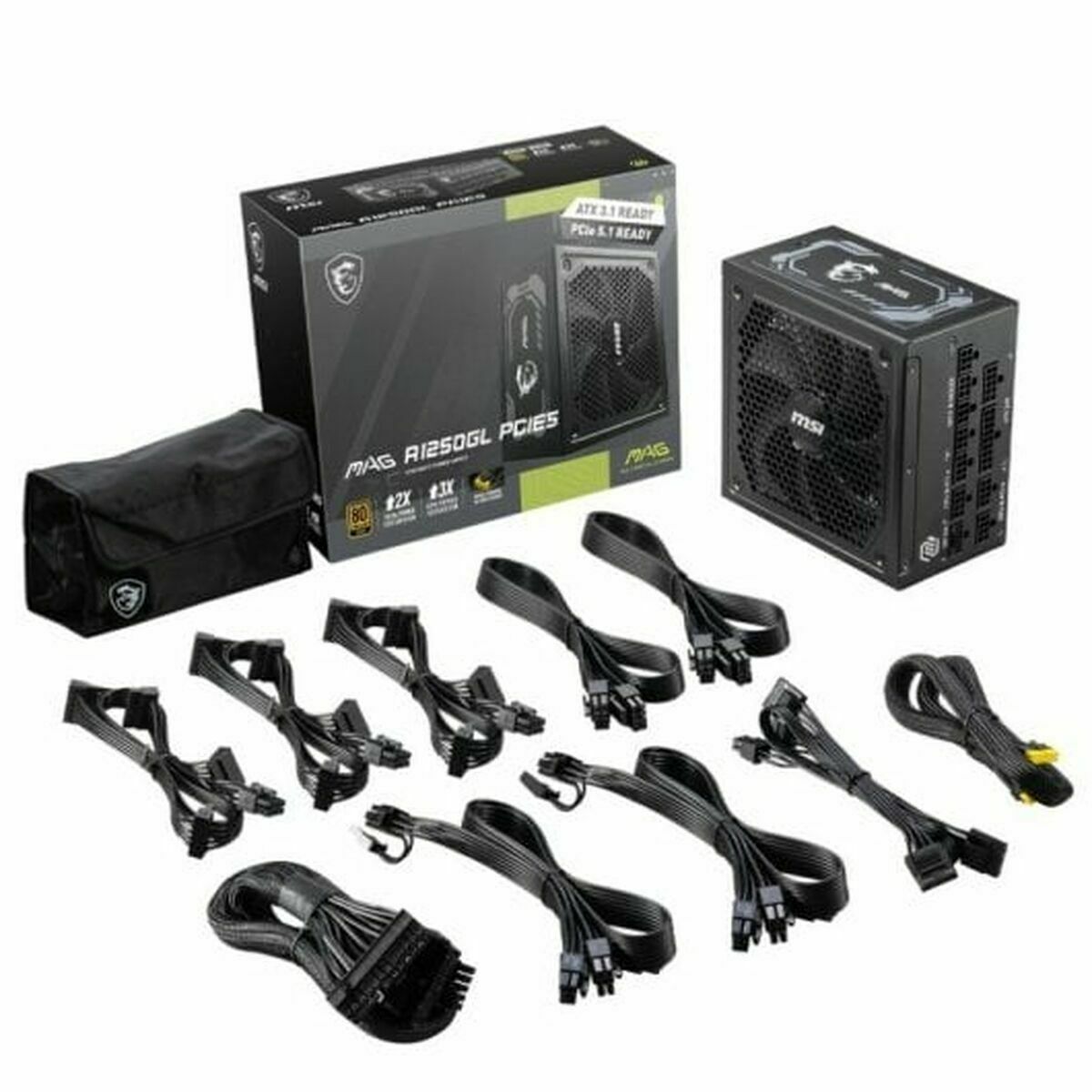 MSI MAG A1250GL PCIE5. Potencia total: 1250 W, Voltaje de entrada AC: 100 - 240 V, Frecuencia de entrada AC: 50/60 Hz. Alimentador de energía para tarjeta madre: 24-pin ATX, Longitud del cable de alimentación de la placa base: 60 cm, Longitud del cable de alimentación SATA: 500 mm. Utilizar con: PC, Factor de forma de fuente de alimentación (PSU): ATX, Certificación 80 PLUS: 80 PLUS Gold. Color del producto: Negro, Tipo de enfriamiento: Activo, Diámetro de ventilador: 13,5 cm. Cables incluidos: CPU, PCIe, Peripheral (Molex), SATA