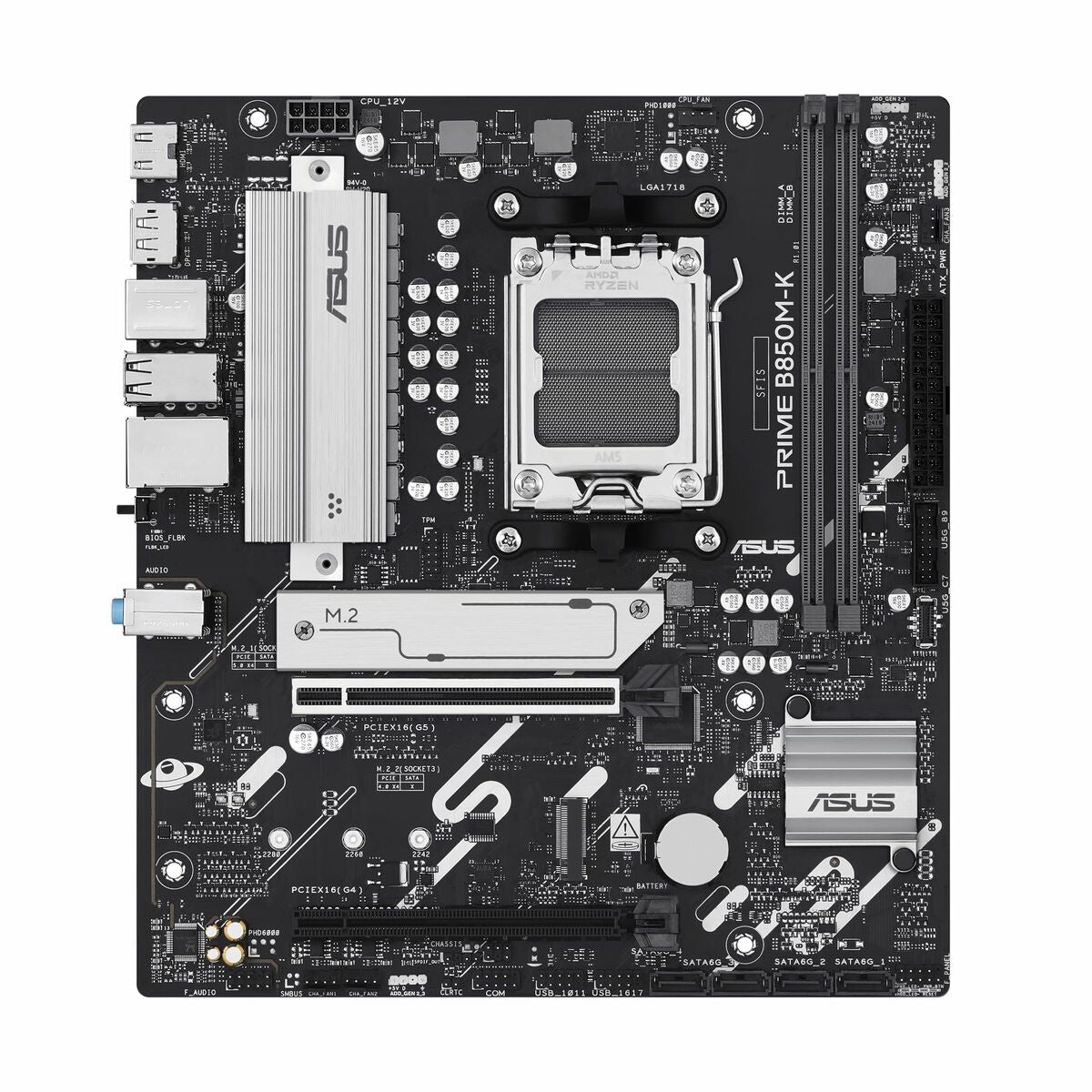 ASUS PRIME B850M-K. Fabricante de procesador: AMD, Socket de procesador: Zócalo AM5, Procesador compatible: AMD Ryzen 7000 Series, AMD Ryzen 8000 Series, AMD Ryzen 9000 Series. tipos de memoria compatibles: DDR5-SDRAM, Memoria interna máxima: 128 GB, Tipo de ranuras de memoria: DIMM. Interfaces de disco de almacenamiento soportados: M.2, SATA III, Tipos de unidades de almacenamiento admitidas: HDD & SSD, Niveles RAID: 0, 1, 5, 10. Tipo de interfaz ethernet: 2.5 Gigabit Ethernet. Componente para: PC, Factor de forma: micro ATX, Familia del chipset: AMD